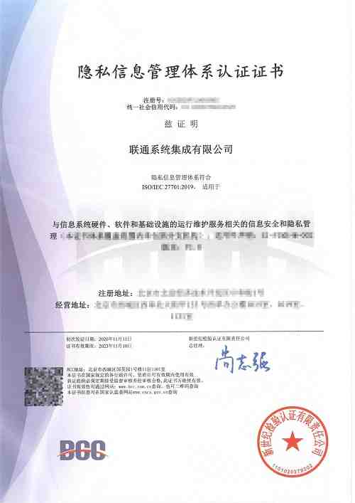 2020年11月13日,聯(lián)通系統(tǒng)集成有限公司(以下簡稱:聯(lián)通系統(tǒng)集成)順利獲得由新世紀(jì)檢驗(yàn)認(rèn)證有限責(zé)任公司(以下簡稱:BCC)頒發(fā)的ISO/IEC 27701 隱私信息管理體系認(rèn)證證書。